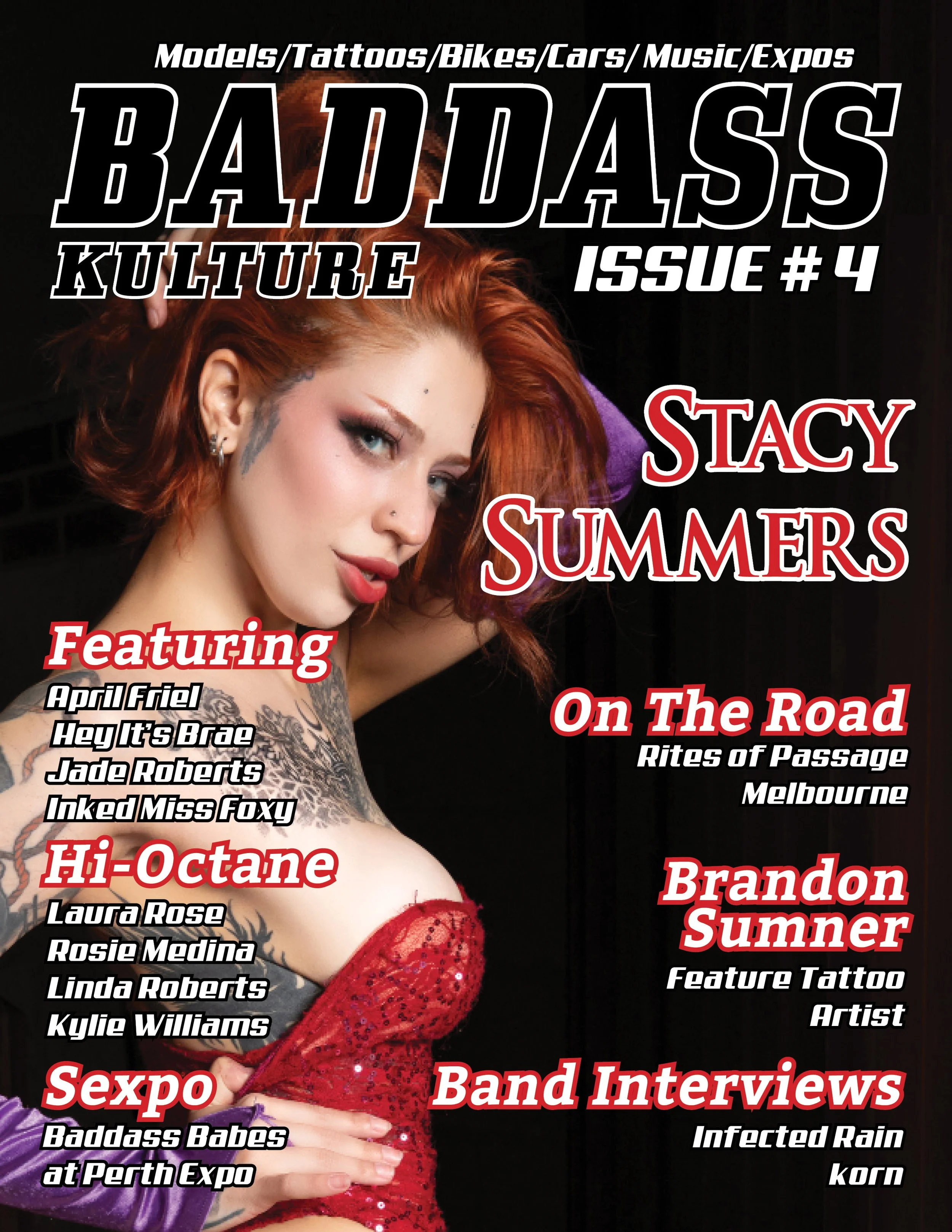 Welcome to Issue #4 which features Perth Hottie Stacy Summers on the Cover and inside joined by April Friel, Inked Miss Foxy, Jade Roberts and Hey it’s Brae. You also need to check out Hi-Octane which includes Rosie Medina, Laura Rose, Linda Roberts and Kylie Williams. On the Music side the is an interview with Infected Rain and Korn and Feature Tattoo Artist comes from Ink In Skin’s Brandon Sumner. On The Road takes us to the Epic Showcase of Melbourne’s Rites of Passage while we finish our trip to Perth Sexpo with Baddass Babes.